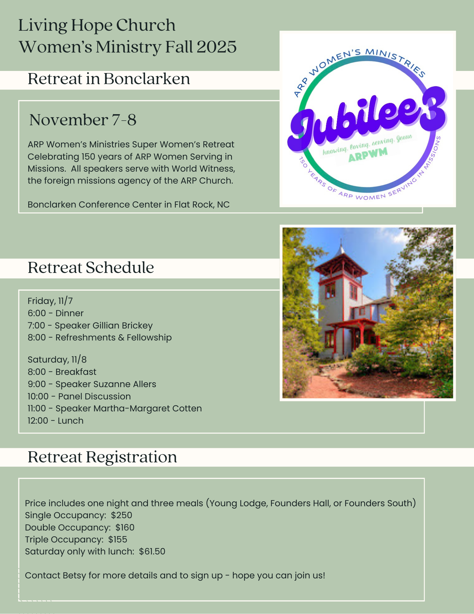 Join women in our denomination at Bonclarken for an overnight retreat celebrating 150 years of women serving in missions.
